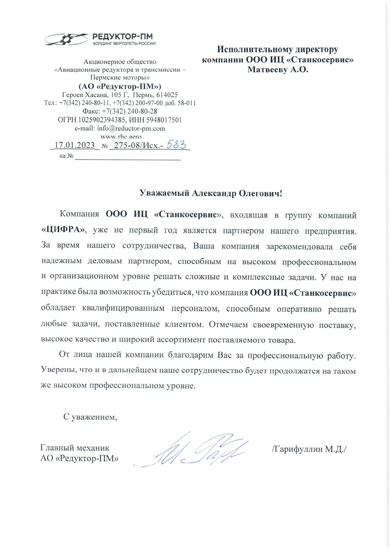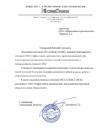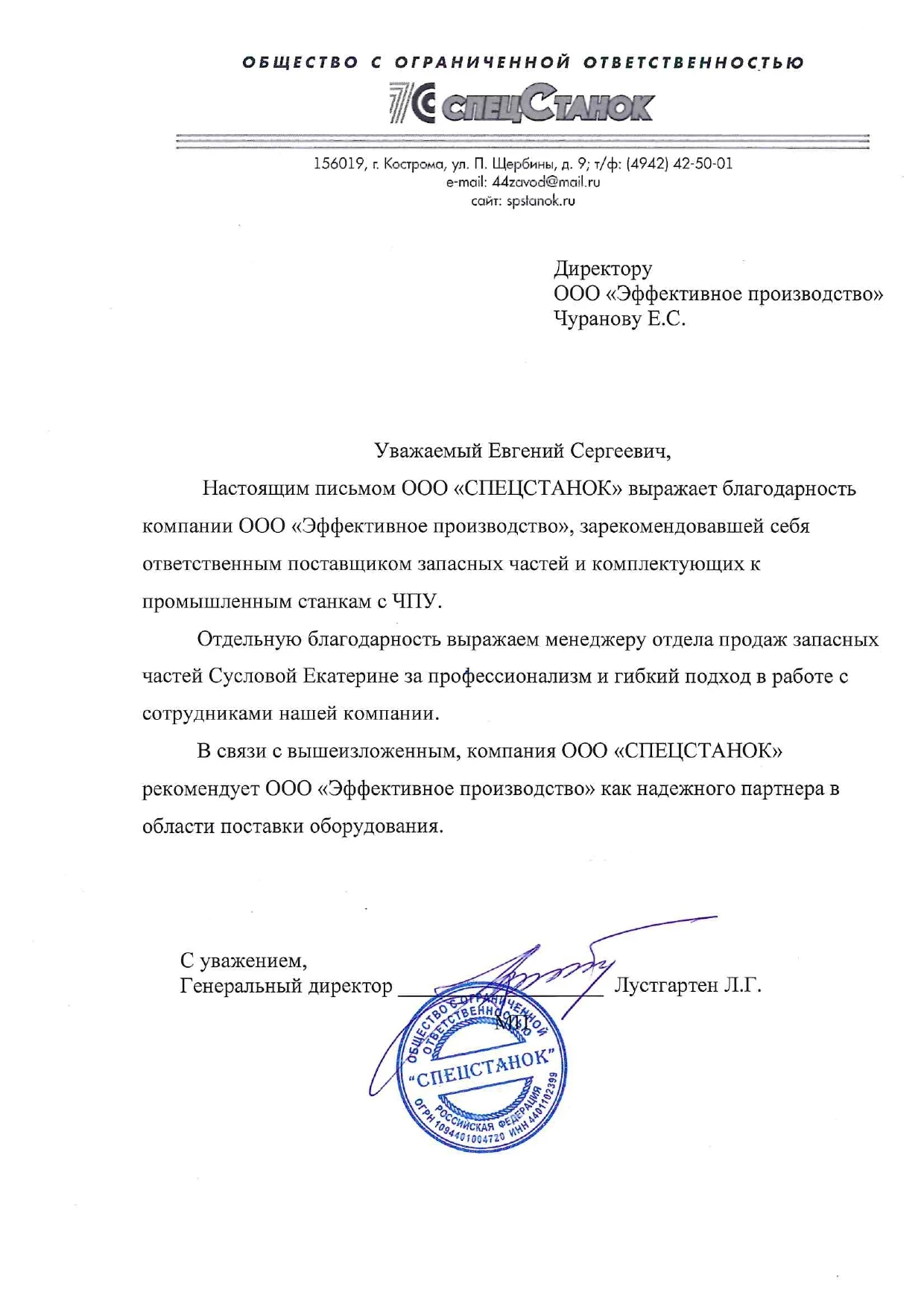 Настоящим письмом ООО «СПЕЦСТАНОК» выражает благодарность