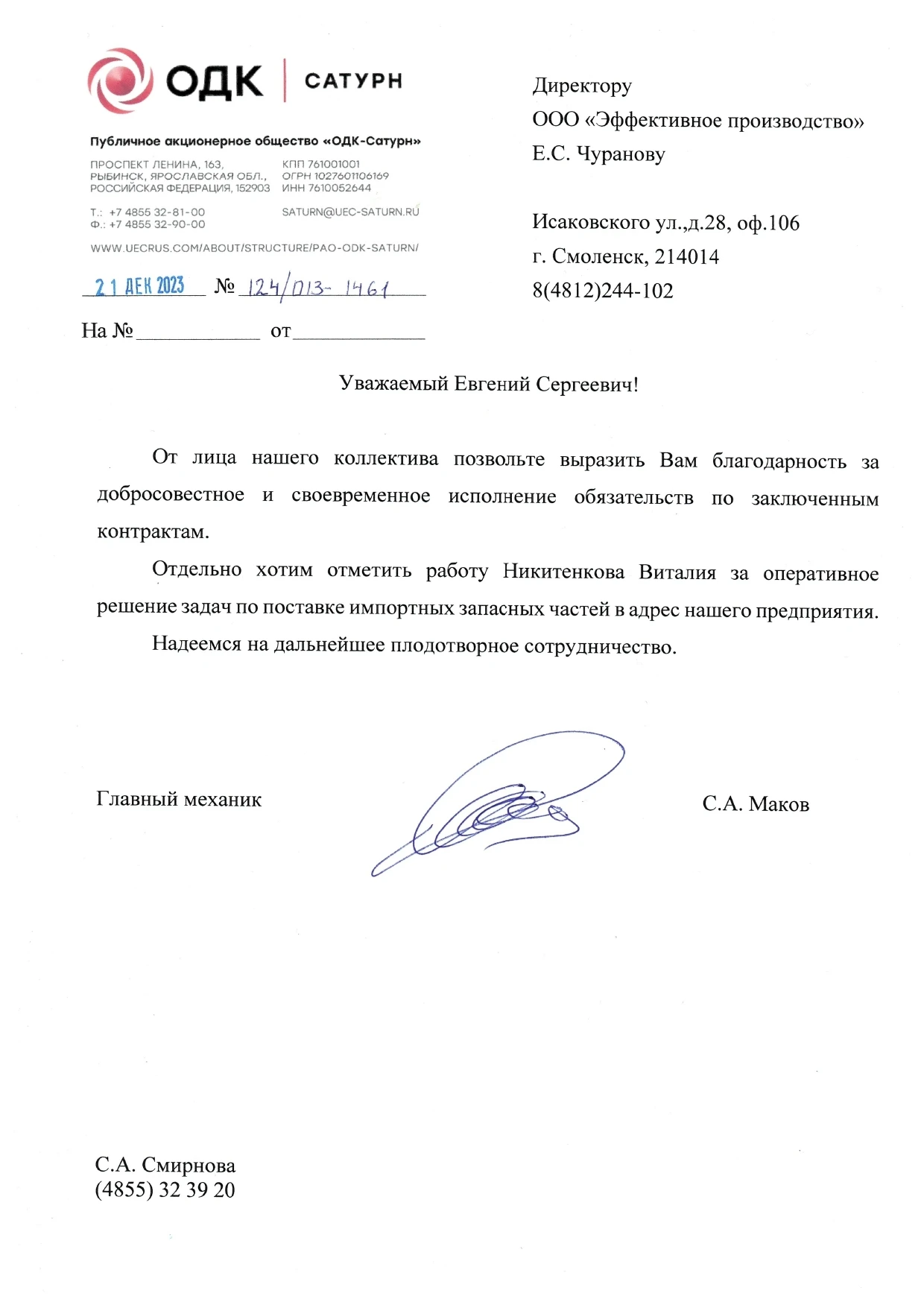 Отдельно хотим отметить работу сотрудника компании ООО «Эффективное производство» Оганяна Армена Мурадовича за оперативное и качественное решение задач по поставке импортных запасных частей в адрес нашего предприятия.